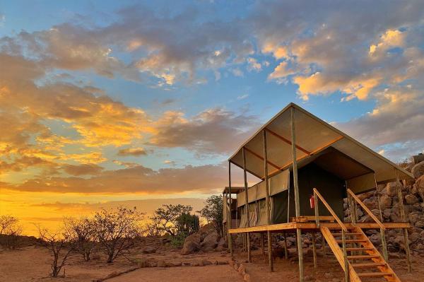 Nested within the rugged landscapes of Damaraland, Buruxa Camp beckons adventurers seeking a unique escape in Namibia. This intimate camp features just five luxury tented rooms, allowing for an exclusive and personalized experience in the heart of nature.